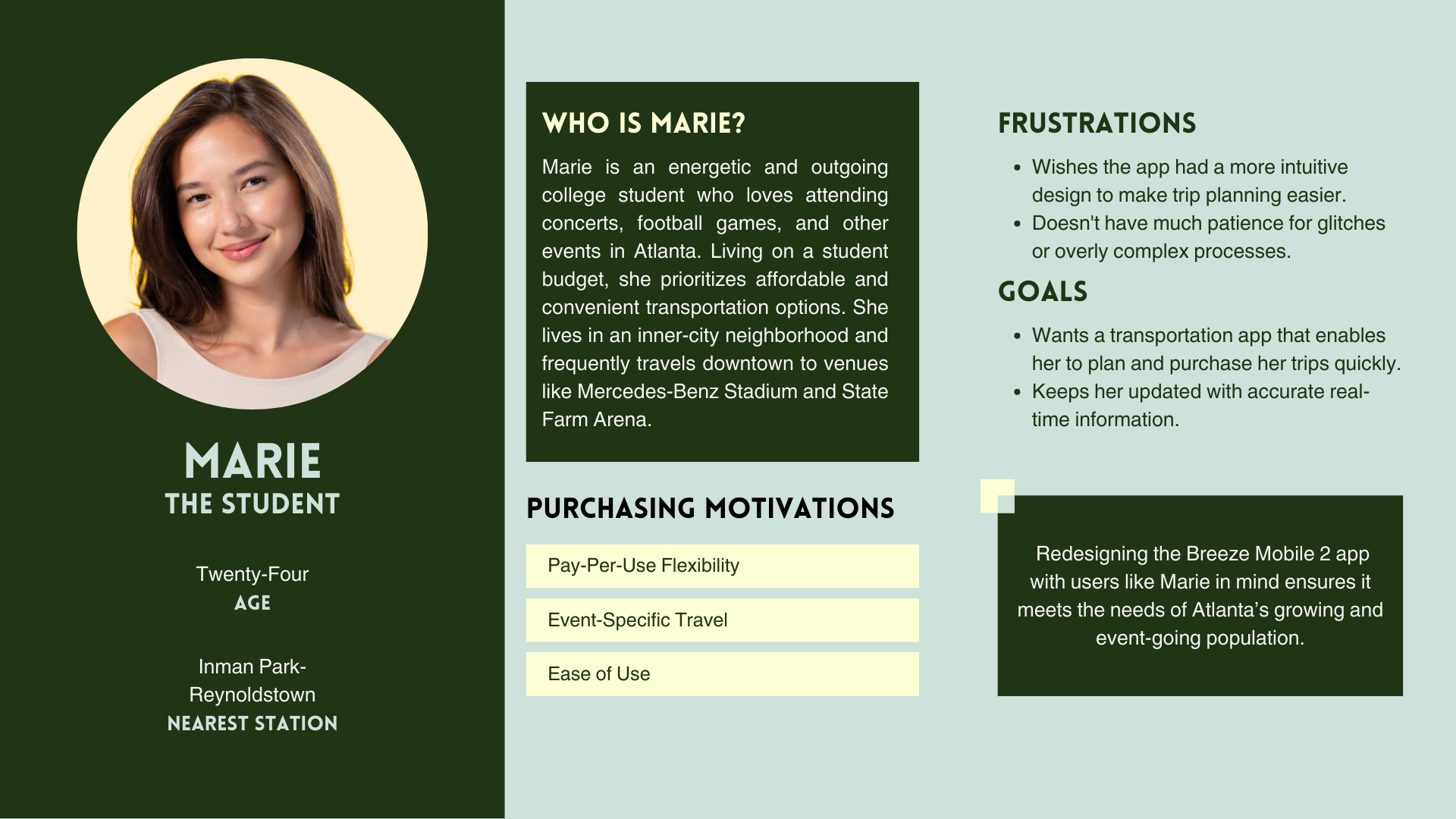 Our user personas represent a diverse range of MARTA riders, ensuring that the redesigned Breeze Mobile app is inclusive, accessible, and user-friendly for people of all ages, backgrounds, and technological comfort levels.