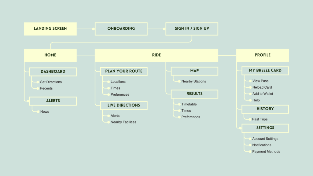 Key features like fare management, route planning, and real-time updates are streamlined under intuitive subcategories to reduce friction. Onboarding and sign-in are placed upfront to ensure a smooth entry point, while essential actions like reloading the Breeze Card and accessing directions are easily accessible to enhance user engagement and convenience.