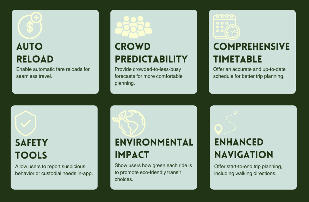 Using insights from research and journey mapping, we brainstormed and prioritized features that enhance usability, accessibility, and engagement to create a more user-friendly transit experience.